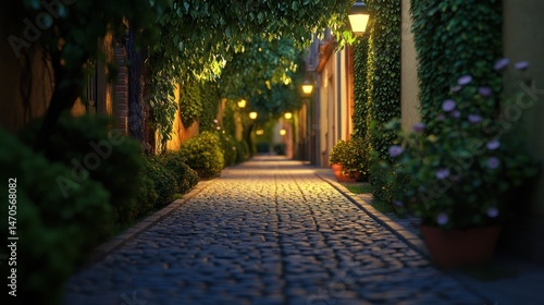 Fototapeta premium Cobblestone alley, evening light, plants, romantic ambiance, travel