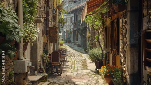 © Nima, Fototapeta premium Cobblestone Alleyway with Stone Buildings and Plants - A narrow cobblestone alleyway winds through a village, lined with stone buildings and lush greenery.