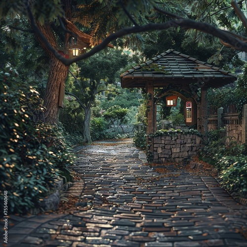 Fototapeta premium Cobblestone path leading to a digital kiosk