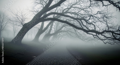 Obraz premium Cobblestone path lined with bare trees in thick fog