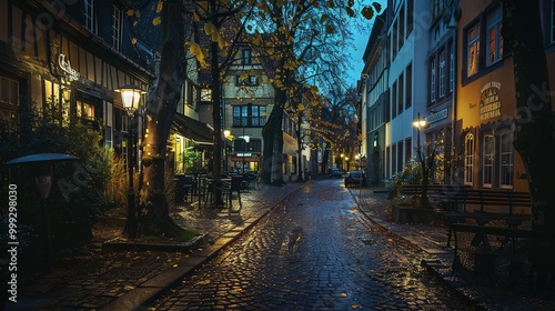 © larrym, Fototapeta premium Cobblestone Street at Night in a European City