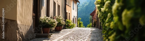 © narak0rn, Fototapeta premium Cobblestone street in a European village with old buildings and greenery.