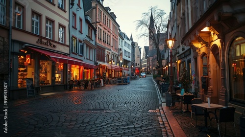 © Ahmad-Muslimin, Fototapeta premium Cobblestone Street in European City with Illuminated Shops and Restaurants at Dusk