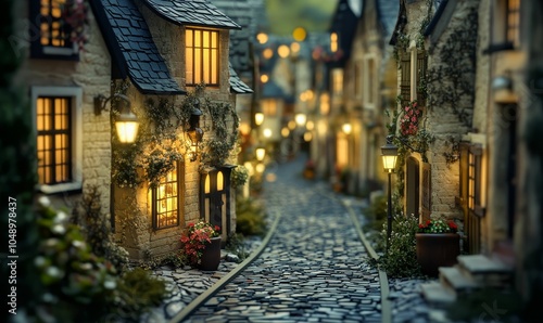 © jambulart, Fototapeta premium Cobblestone street lined with quaint stone houses.