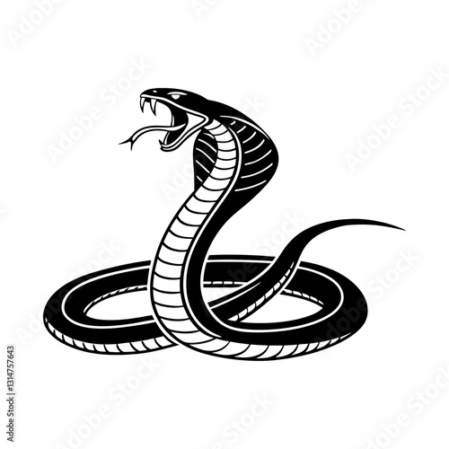 © Vector art Design, Fototapeta premium Cobra in Defensive Posture: A majestic king cobra, rendered in stark black and white, raises its hood in a defensive posture, its forked tongue flicking, showcasing its power and grace.