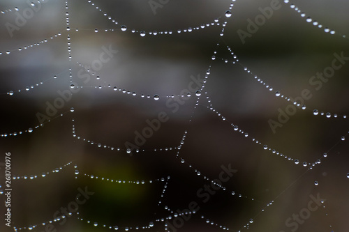 © Ольга Холявина, Naklejka premium Cobweb with dew drops close up. Background image. Macro photo. The concept of amazing metamorphosis in nature. Macrocosm.