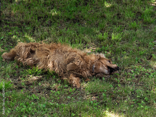 Fototapeta premium cocker spaniel dog playing and rolling in the green grass