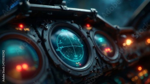 Fototapeta premium Cockpit Instruments: A detailed close-up of vintage cockpit instruments, dials glowing, displaying a futuristic yet retro aesthetic, hinting at the mystery of navigation.