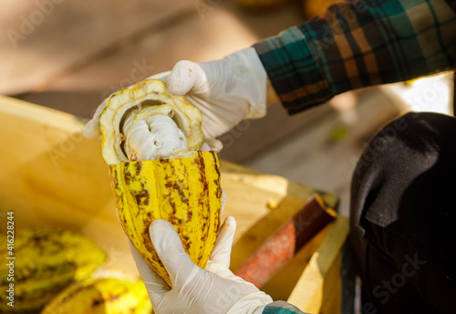 © freedom_naruk, Obraz premium Cocoa beans and cocoa pod on a wooden surface.