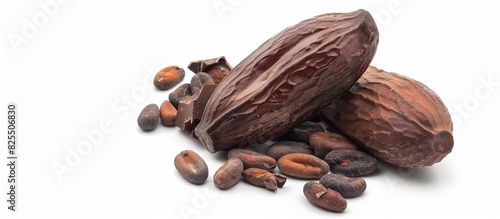 © anatoliycherkas, Obraz premium Cocoa beans with cocoa pod isolated on white background