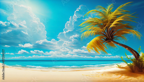 © AI_images, Fototapeta premium Coconut Palm tree on amazing perfect white sandy beach in island of Maldives. . Generate Ai.