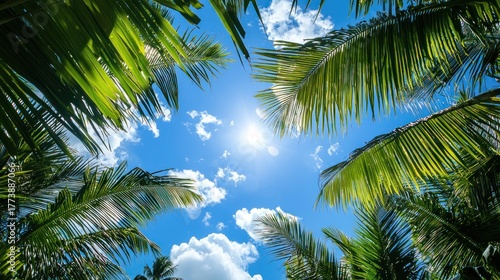 Fototapeta premium Coconut palm trees against a blue sky with white clouds.
