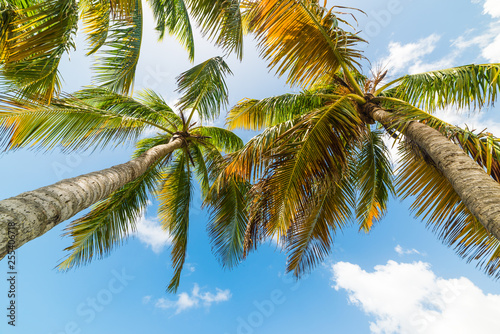 © Gabriele Maltinti, Fototapeta premium Coconut palm trees seen from below in Guadeloupe