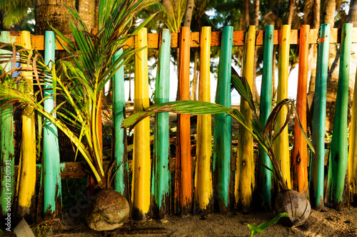 © Zstock, Fototapeta premium Coconut seedlings with colourful coconut fern fence