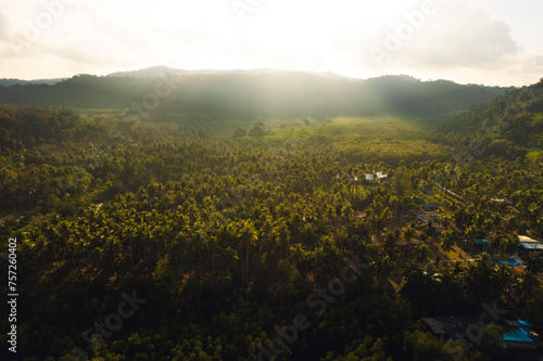 © artrachen, Obraz premium Coconut tree garden by the sea on the island, high angle view