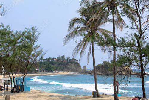 © Hani chusna, Obraz premium Coconut trees line the blue sea background of Klayar Pacitan beach, a beach famous for its white sand.