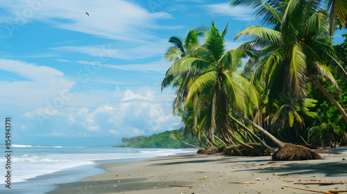 Obraz premium Coconut trees on a pristine beach, their roots firmly preventing coastal...