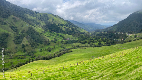 © bobbyw, Fototapeta premium Cocora Valley in Colombia looking out into the majestic mountain valley with a fence line rolling over the hill