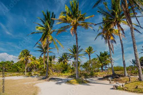 © Eagle2308, Obraz premium Cocos palms near mayan Ruins in Tulum, Riviera Maya, Yucatan, Caribbean Sea, Mexico