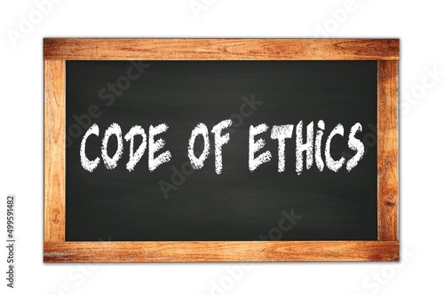 Fototapeta premium CODE OF ETHICS text written on wooden frame school blackboard.
