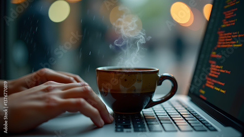 Obraz premium Coding marathon captured through hyper-detailed coffee droplets and motion-blurred programmer hands.