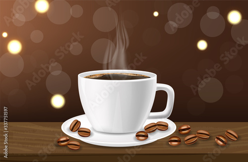 Obraz premium Coffee banner realistic, black coffee cup and coffee beans, white cup realistic, hot drink