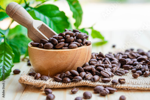Obraz premium Coffee bean medium roasted in wooden bowl with leaf in fresh morning.