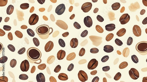 © kkkiim graphic, Obraz premium coffee bean mug cup seamless pattern white background