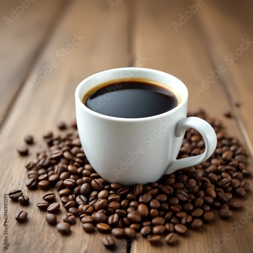 © Lamia, Fototapeta premium Coffee Beans and Coffee Cups on Rustic Wooden Background. Cafe and Beverage Photography
