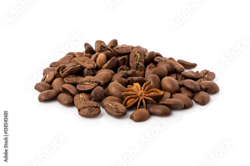 © creative, Naklejka premium Coffee beans and spices scattered on white, food photo