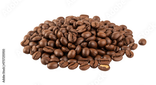 © Raul, Naklejka premium Coffee beans are piled together in a heap, exhibiting their roasted color and textured surface.