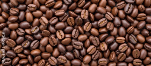 © Cherrin, Fototapeta premium Coffee beans arranged in a textured pattern, showcasing their rich brown colors.