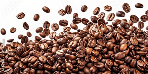 © Sandra, Naklejka premium Coffee beans cascade downwards in slow motion, scattered against a transparent background, showcasing their unique shapes and rich brown colors in high-definition detail.