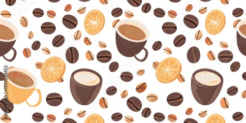 Obraz premium Coffee beans citrus slice and beverage cups seamless pattern