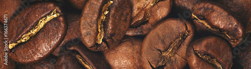 Obraz premium Coffee beans closeup on natural texture, border design panoramic banner....