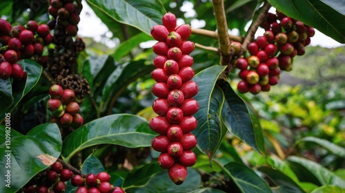 © pornpong, Obraz premium Coffee beans growing on a tree in a lush tropical setting highlighting the process of coffee cultivation