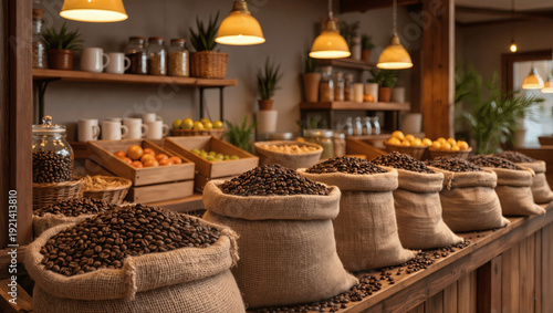 Fototapeta premium Coffee beans in burlap sacks at a market or cafe