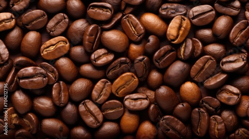 © Cherkasova Alie, Naklejka premium Coffee beans in close-up. The texture of the coffee. Production of natural coffee. Roasted grains, aroma, morning drink.