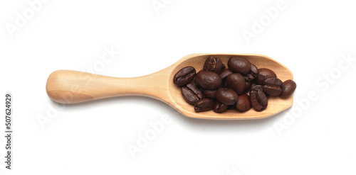 © Sai, Obraz premium Coffee beans in Wooden scoop isolated on white background, Top view