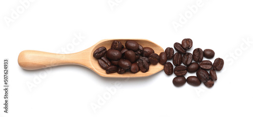 © Sai, Fototapeta premium Coffee beans in Wooden scoop isolated on white background, Top view
