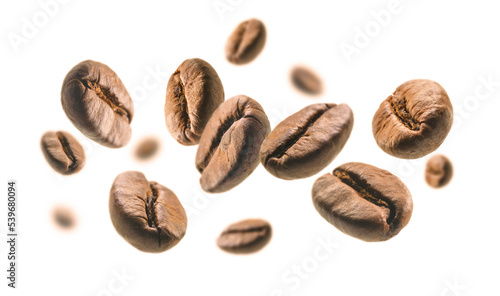 Fototapeta premium Coffee beans levitate on a white background