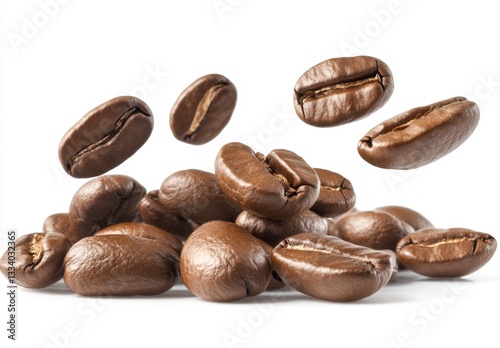 © Packgenix, Obraz premium Coffee beans levitating over pile, white background