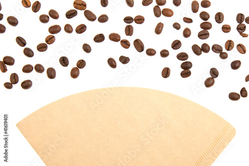 © michaklootwijk, Obraz premium Coffee beans on a coffee filter (white background)