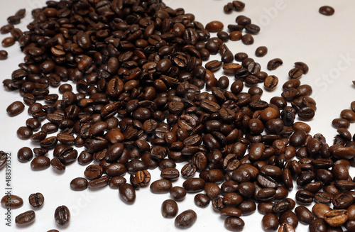 Naklejka premium Coffee beans on a white background, close-up with free space, horizontal,...