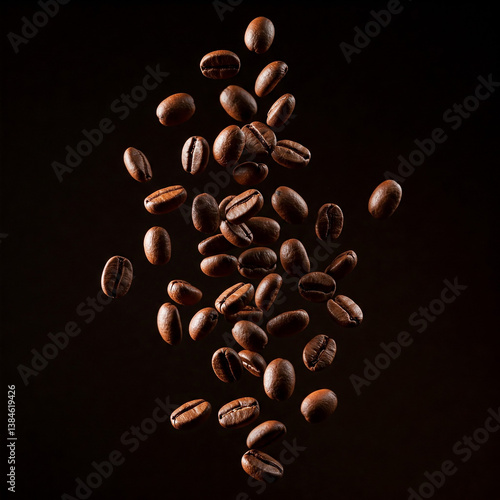 © Sumanta, Obraz premium coffee beans on black background. Coffee beans in flight on a dark background. flying coffee beans.