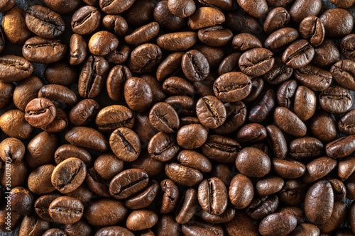 Fototapeta premium Coffee beans on black caffeine breakfast background. For cup of dark espresso...