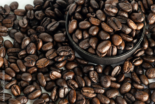 © Naknakhone, Fototapeta premium Coffee Beans on white background. close up. Coffee grounds. Freshly roasted coffee beans. Image of a drink made from granules, derived from coffee plant. Copy space for text.