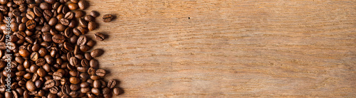 Fototapeta premium coffee beans on wide bright panorama wooden background copy space