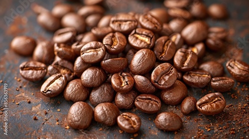 © TheWaterMeloonProjec, Naklejka premium Coffee beans roasted and stacked on table