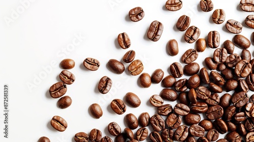 Naklejka premium Coffee beans scattered on a clean white background, showcasing their texture and rich color, perfect for coffee-related presentations or advertisements.
